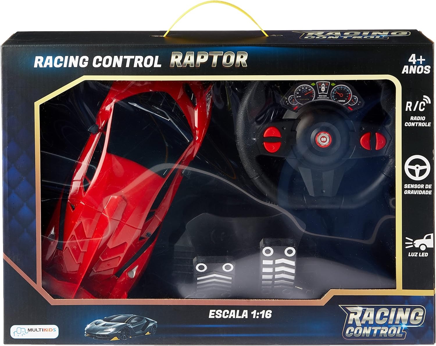 \par Acelere para valer com Racing Control Raptor e simule a experi\'eancia de dirigir um carro de verdade. Possui pedais para acelera\'e7\'e3o e o controle remoto \'e9 em formato de volante, com sensor de gravidade para movimenta\'e7\'e3o direita e esquerda. Alcan\'e7a dist\'e2ncia de at\'e9 10 metros em escala 1:16, fio de pedal com 1 metro e 40 cent\'edmetros.