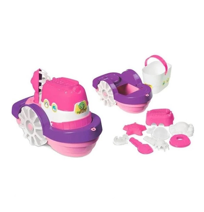 Contém: 1 barco de praia, 1 pá, 1 rastelo, 1 peneira, 1 balde, 1 forma de siri, 1 forma de âncora, 1 forma de bóia, 1 forma de estrela e 1 forma de baleia