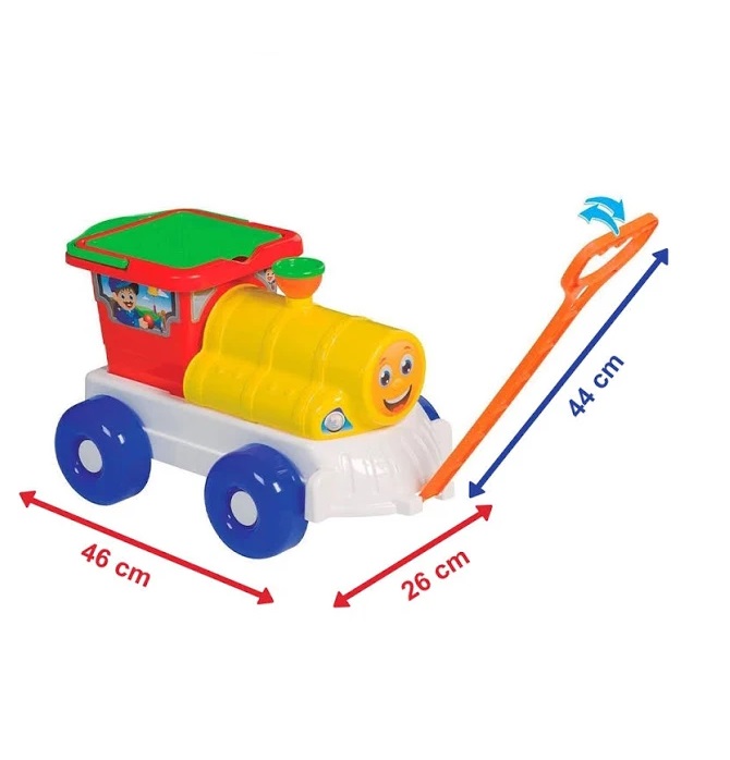 O Trem de Praia possui balde com peneira (cabine), regador com alça (caldeira) e carrinho para carregar objetos.