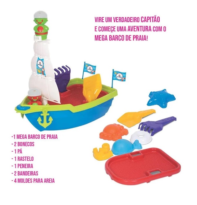Acompanha 2 bonecos, pá, rastelo, peneira e diversos moldes para areia.