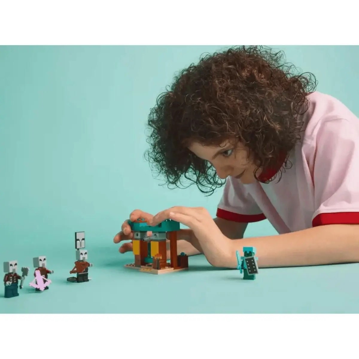 Quando 3 figuras de illagers chegam para roubar o tesouro, as crianças devem defender o posto avançado. O conjunto inclui mísseis que elas podem lançar com um movimento do dedo, uma série de armas e um barril com tesouro.