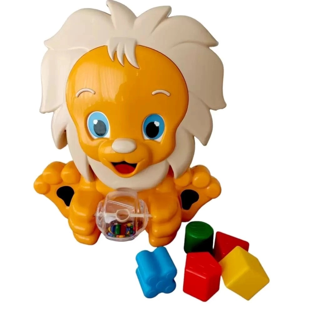 O simpático leãozinho possui uma esfera giratória com bolinhas, além de 5 divertidas formas para encaixar.