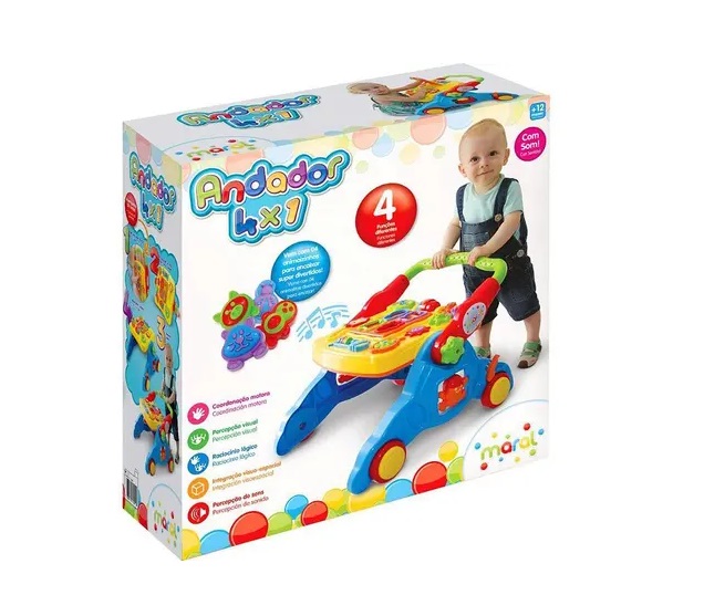 \par O andador 4 em 1 da Maral \'e9 o brinquedo ideal para acompanhar o desenvolvimento do seu beb\'ea. Este produto tem 4 fun\'e7\'f5es: \'e9 um suporte para ber\'e7o, que depois vira apoio de ch\'e3o para quando o beb\'ea j\'e1 estiver sentando, ap\'f3s isso pode ser usada como mesa de atividades e por fim como andador. O Andador 4 em 1 possui sons, al\'e7a m\'f3vel, rodinhas, travas nas rodinhas, rel\'f3gio, bichinhos para encaixar e muito mais!