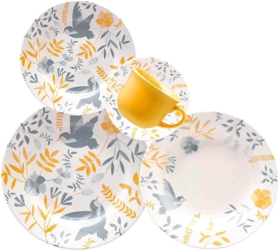 Donna Bem-te-vi é a decoração que representa a fauna e flora do Brasil nos pratos da coleção. Em tons de amarelo e azul claro, ramos, flores e o delicado passarinho Bem-te-vi decoram cada peça. A xícara da coleção é toda esmaltada em amarelo, trazendo um ponto de cor em destaque no aparelho de jantar. O aparelho de jantar de 30 peças compõe uma mesa para 6 pessoas.