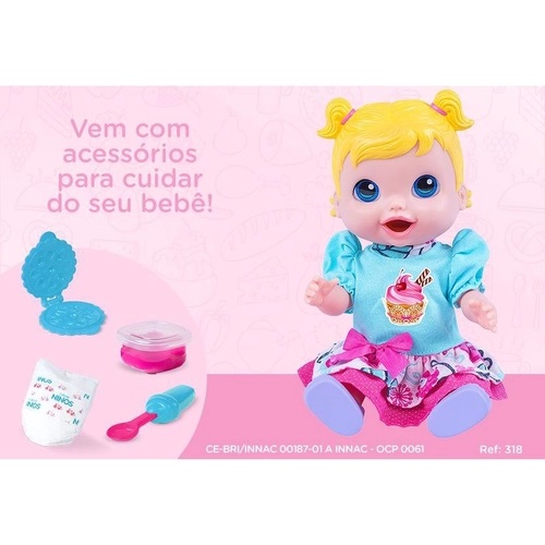 Conteúdo da embalagem: 01 Boneca, 01 forma para comidinhas, 01 colher, 01 pote de comidinha, 01 par de sapatinhos e 01 fralda.