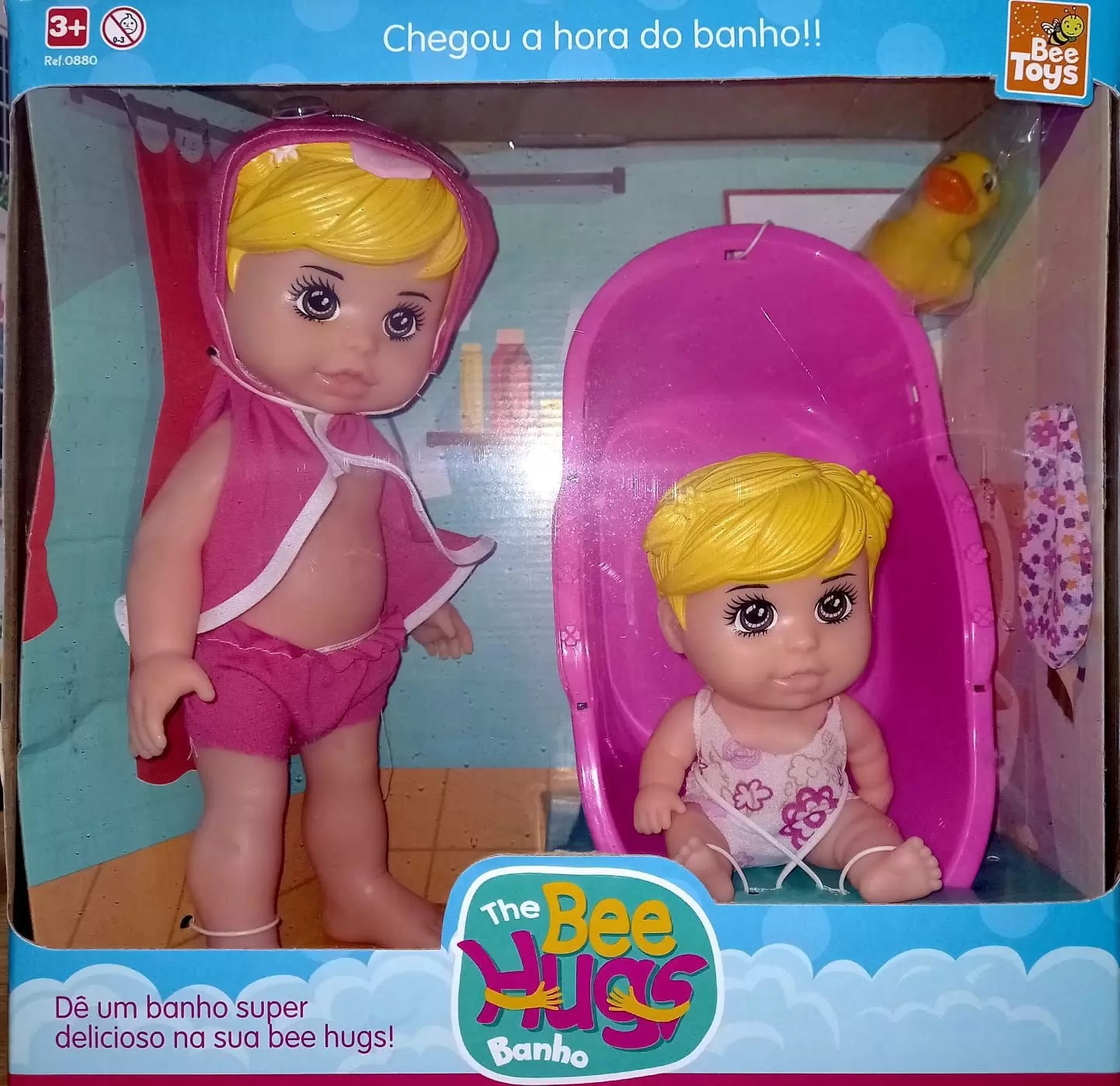 Chegou a hora do banho! Dê um banho super delicioso na sua baby bee hugs! Vem com patinho e uma banheirinha linda! Bonecas 100 % Vinil. Todas feitas em vinil atóxico.