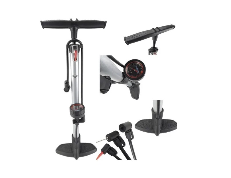 É o item para ter sempre por perto. Com o corpo produzido em aço, possui base para os pés e manômetro que indica a pressão.