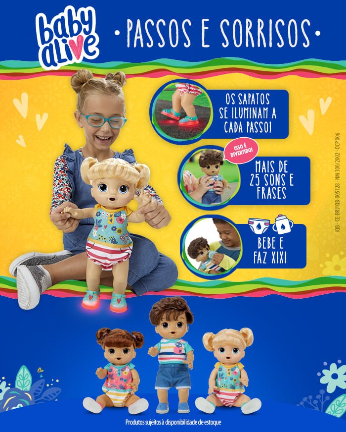 A Boneca Baby Alive - Passos e Sorrisos tem sapatos que se iluminam a cada passo! As crianças podem fingir andar, pular e pular com o bebê para ativar seus sapatos leves, ela solta risadinhas adoráveis e frases divertidas. Dê ao bebê alguns goles de sua garrafa e ela "faz xixi" em sua fralda.