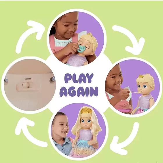 Esta boneca falante cresce aos poucos com os cuidados das crianças e responde com mais de 75 sons e frases. Um carrilhão cintilante toca quando ela cresce! Quando bebê, ela cresce lentamente balançando, usando chupeta e fingindo se alimentar com seu copinho e tigela/colher. Movimentos saltitantes e fingir comer/beber a ajudam a continuar crescendo!