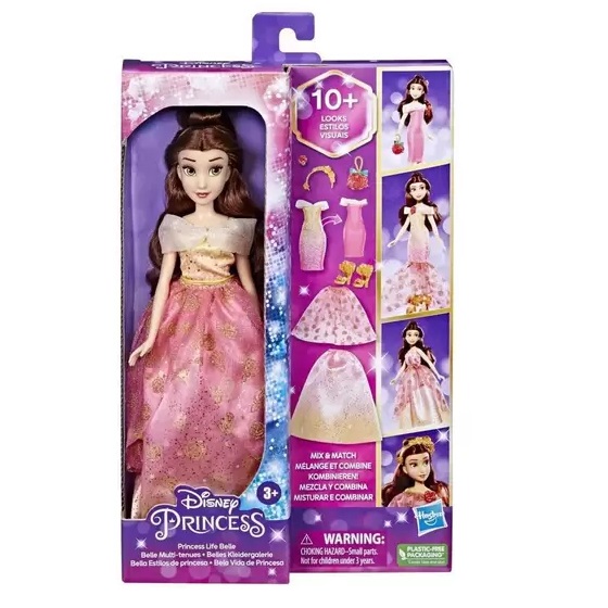 A boneca Bela de 28 cm vem com roupas que podem ser combinadas em diferentes camadas. A boneca vem com vestido de dupla face removível, 2 saias, tiara, concha, bolsa e sapatos.