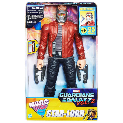 Este é o Boneco eletrônico Star Lord Music Mix da Hasbro. Ele tem aproximadamente 30 Centímetros e reproduz as principais músicas que cativa e emociona o personagem do filme Guardiões da Galaxia.
