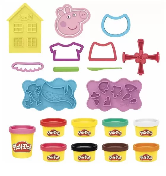 - Conteúdo da embalagem: Carimbo de 4 faces, 5 cortadores, rolo, 3 moldes e faca de plástico para criar a Peppa Pig e 9 potes de massinha play doh.