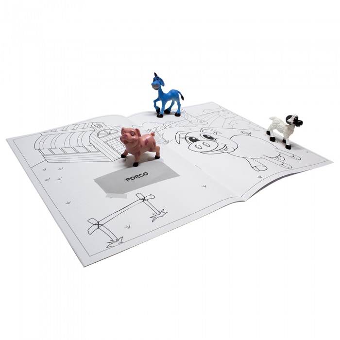 Acabamento: Livro brochura com animais de plástico, embalagem de blister e box de papelão.