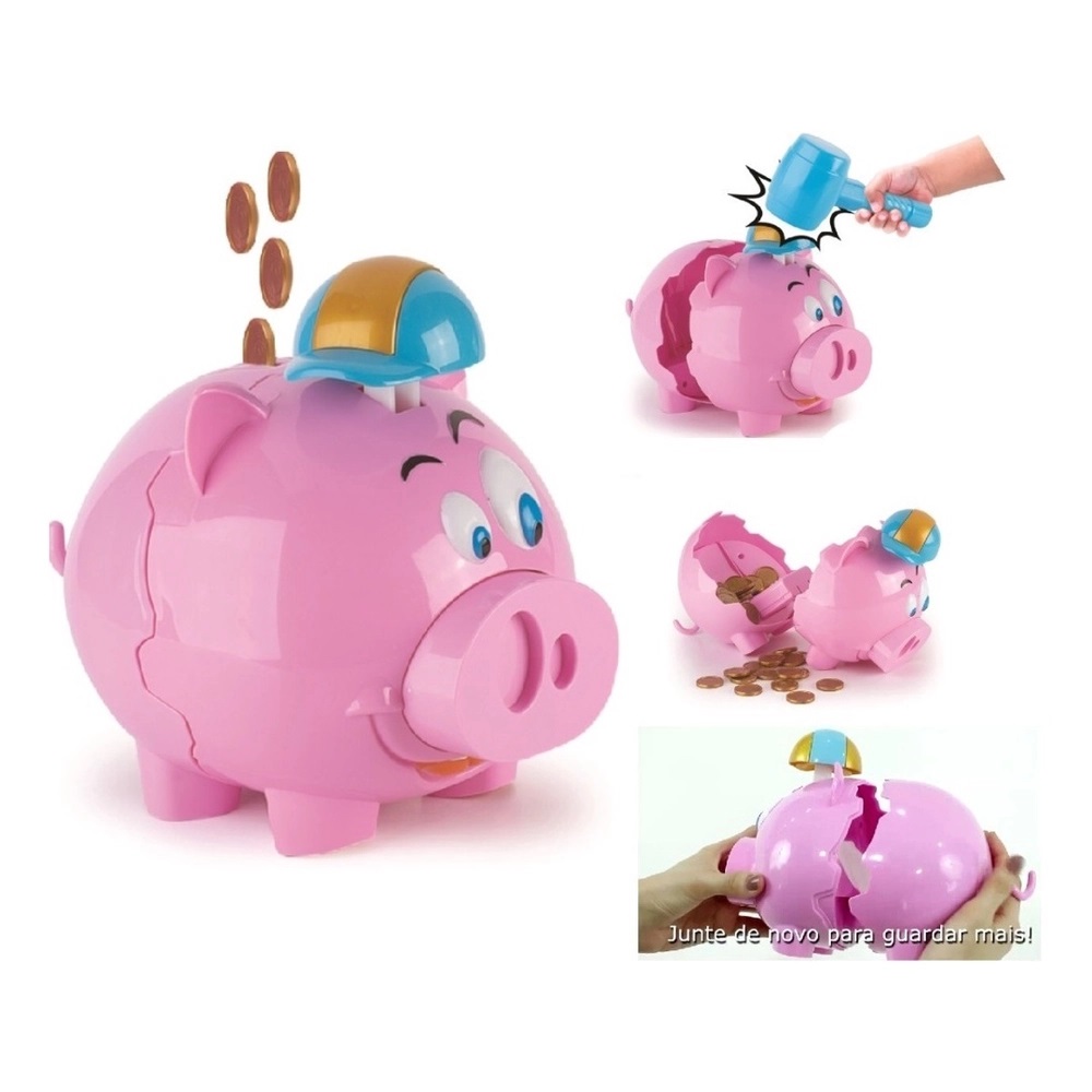 Basta colocar o dinheiro dentro do porquinho, quando ele estiver cheio pegue o martelo de brinquedo e bata no chapéu, vai batendo até o porquinho abrir, pegue o dinheiro e feche o porquinho para guardar mais dinheiro.