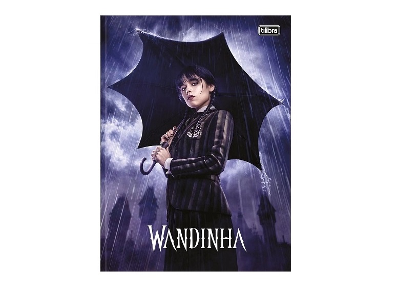 O Caderno Brochura Capa Dura Universitário 1 Matéria Wandinha 80 Folhas possui capa dura com acabamento metalizado, parte interna decorada, bolsa de papel decorada para guardar trabalhos e anotações, folha com adesivos funcionais e folhas pautadas.