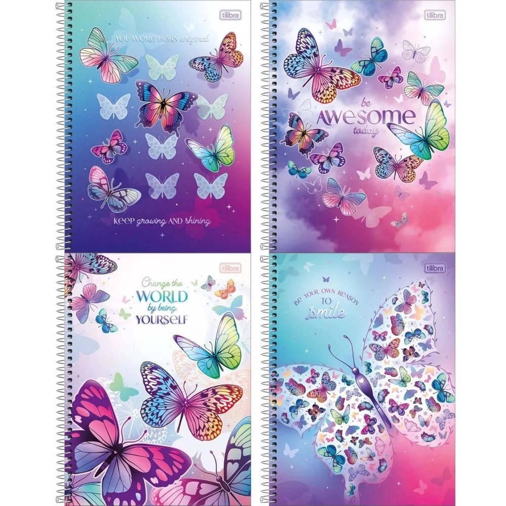 Possui capa dura com acabamento metalizado, parte interna decorada, bolsa de papel decorada para guardar trabalhos e anotações, folha com adesivos funcionais, folhas pautadas decoradas e espiral colorido.