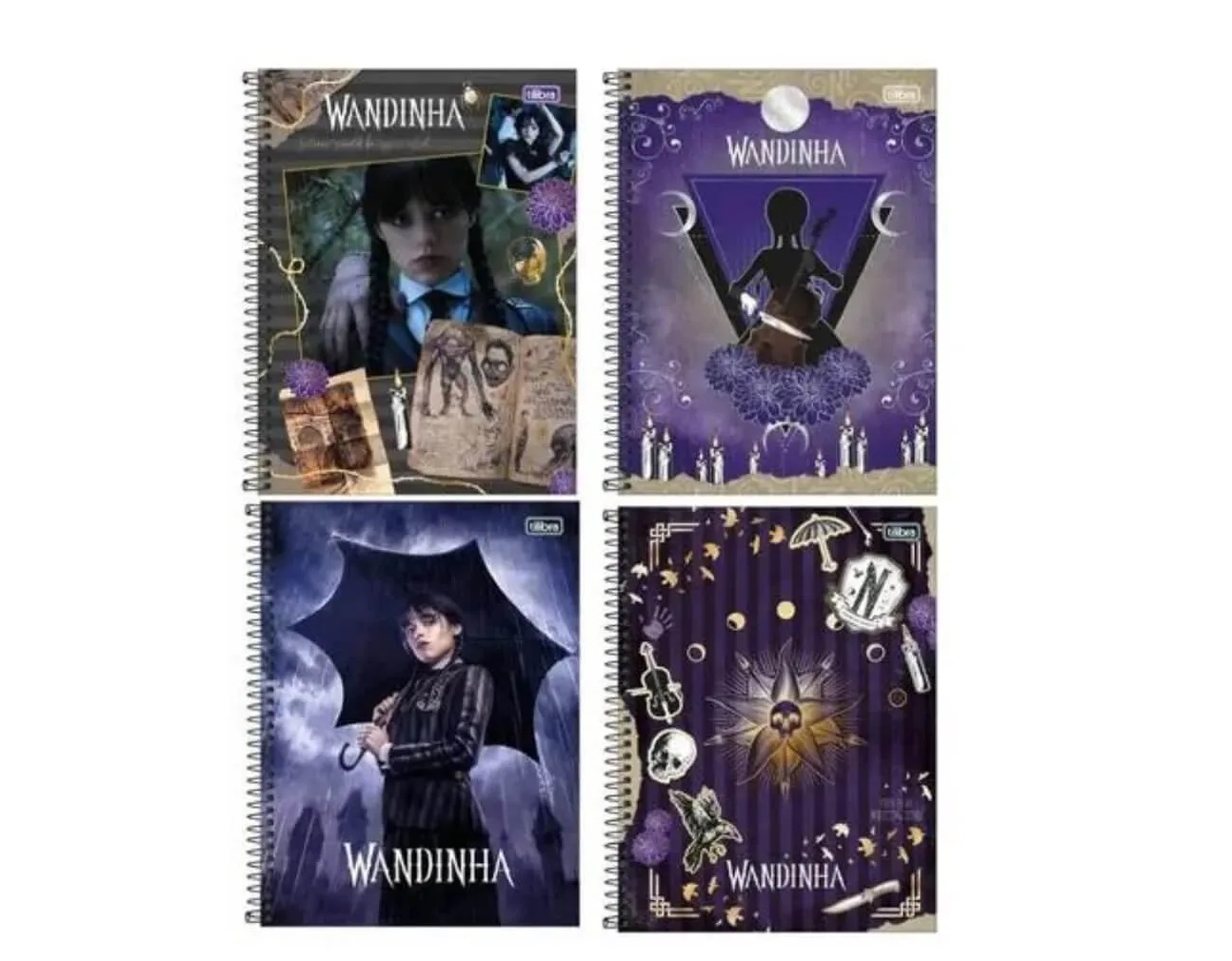 O Caderno Espiral Capa Dura Universitário 10 Matérias Wandinha 160 Folhas possui capa dura com acabamento metalizado, parte interna decorada, bolsa de papel decorada para guardar trabalhos e anotações, folha com adesivos funcionais e folhas pautadas.