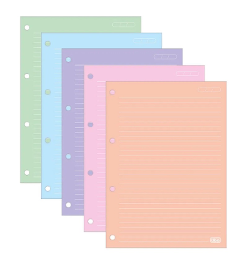 O Refil Tiliflex para Caderno Argolado Universitário Académie 80 Folhas Coloridas com Pautas Brancas 90 gramas possui folhas pautadas coladas em papel colorido nas cores rosa, azul, laranja, roxo e verde. Ideal para o dia a dia na escola ou na faculdade.