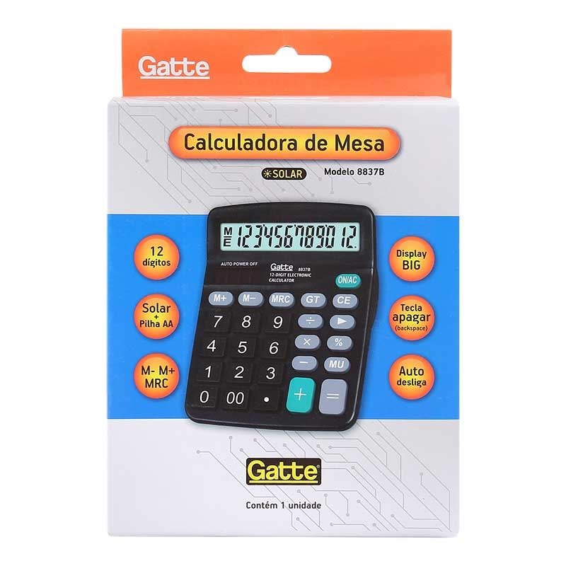 Calculadora eletrônica de mesa, Big display, M- M+ MRC, tecla de correção, Solar + Pilha AA (não inclusa).