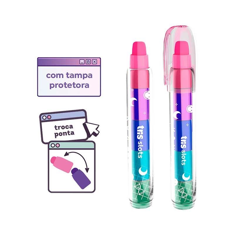 \par A caneta borracha Slots \'e9 super nost\'e1lgica e vem com 5 cores de borracha para trocar a ponta.\fs20