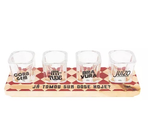 - Contém: 4 copos de cachaça e 1 base de madeira