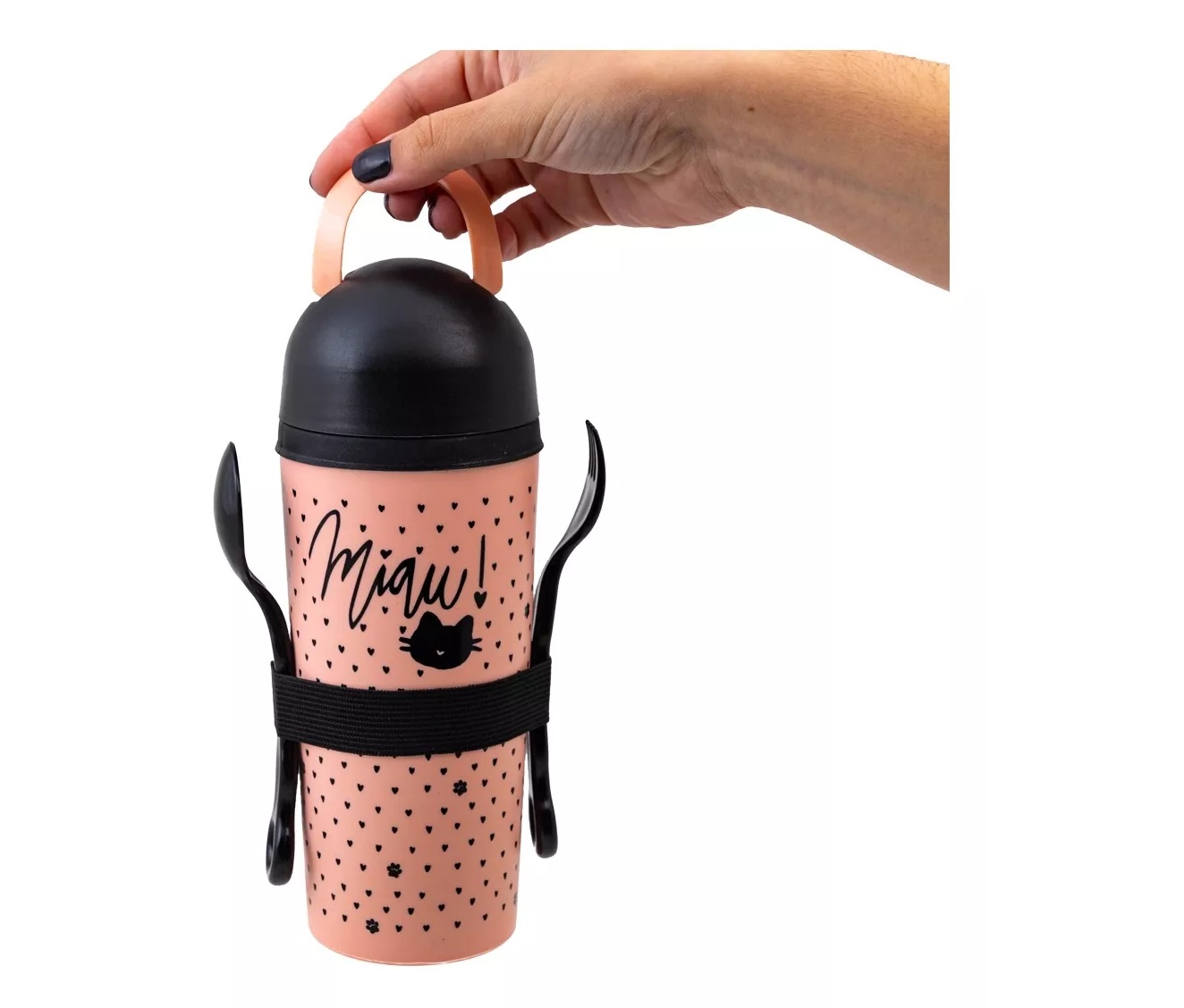 \par Cont\'e9m: 1 copo snack de 420ml, 1 garfo, 1 colher e 1 cinta el\'e1stica porta talheres.