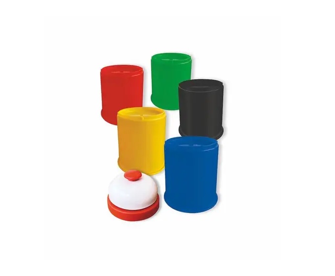 \par Cont\'e9m: 50 cartas, 10 copos coloridos (2 verdes, 2 pretos, 2 amarelos, 2 vermelhos e 2 azuis) e 1 campainha.