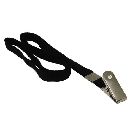 Cordão para crachá, 82cm, tecido preto, com presilha jacaré.