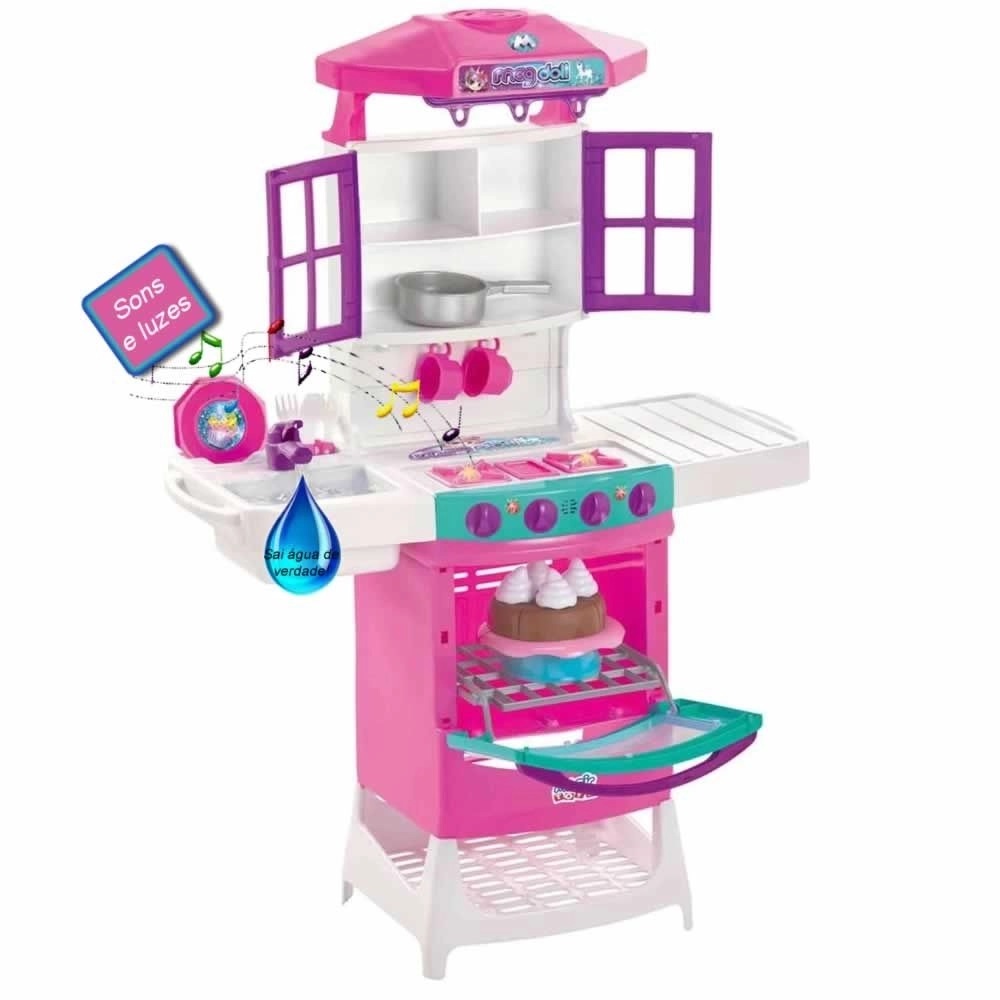 Produzido com material super-resistente a Cozinha Mágica Meg Doll vai encantar a criança. Possui botões que sai sons de fritura e fervura, escorredor de pratos, porta-tudo, muitos acessórios e uma torneira que sai água de verdade, que vai deixar a brincadeira muito mais divertida!