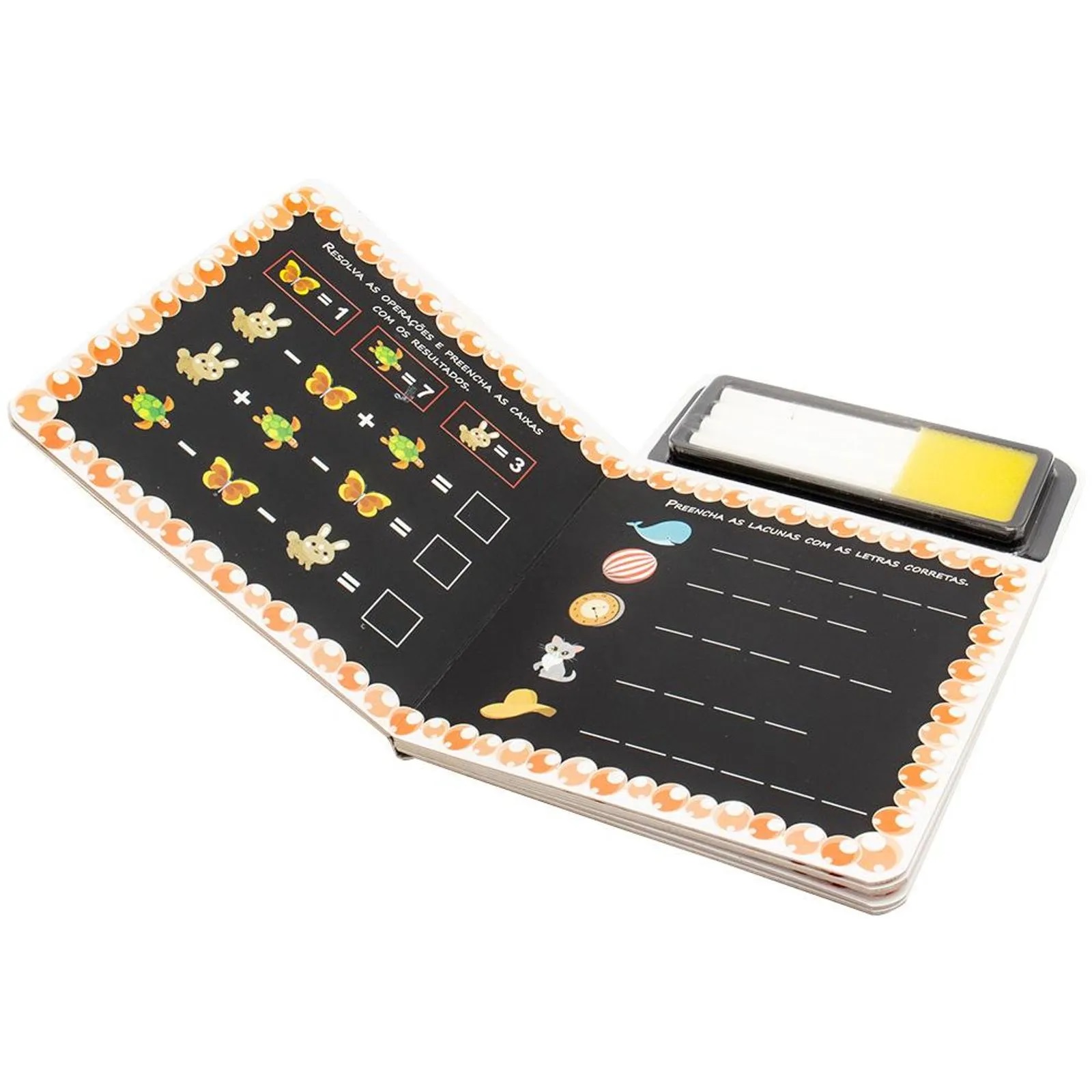 \par A pr\'e1tica leva \'e0 perfei\'e7\'e3o! Quatro gizes e p\'e1ginas tipo lousa re\'fanem horas de divers\'e3o de atividades para escrever e apagar.