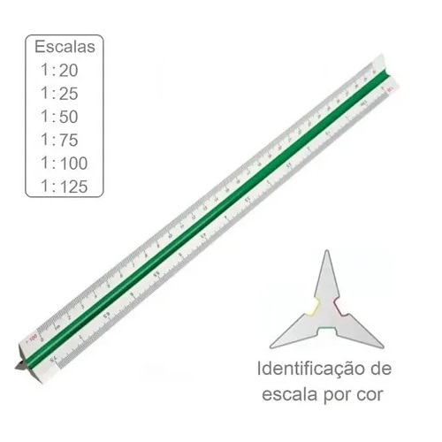 Escalimetro Tris Metric 30cm, com corpo triangular e estojo individual, possui escalas 1:20 – 1:25 – 1:50 – 1:75 – 1:100 – 1:125.