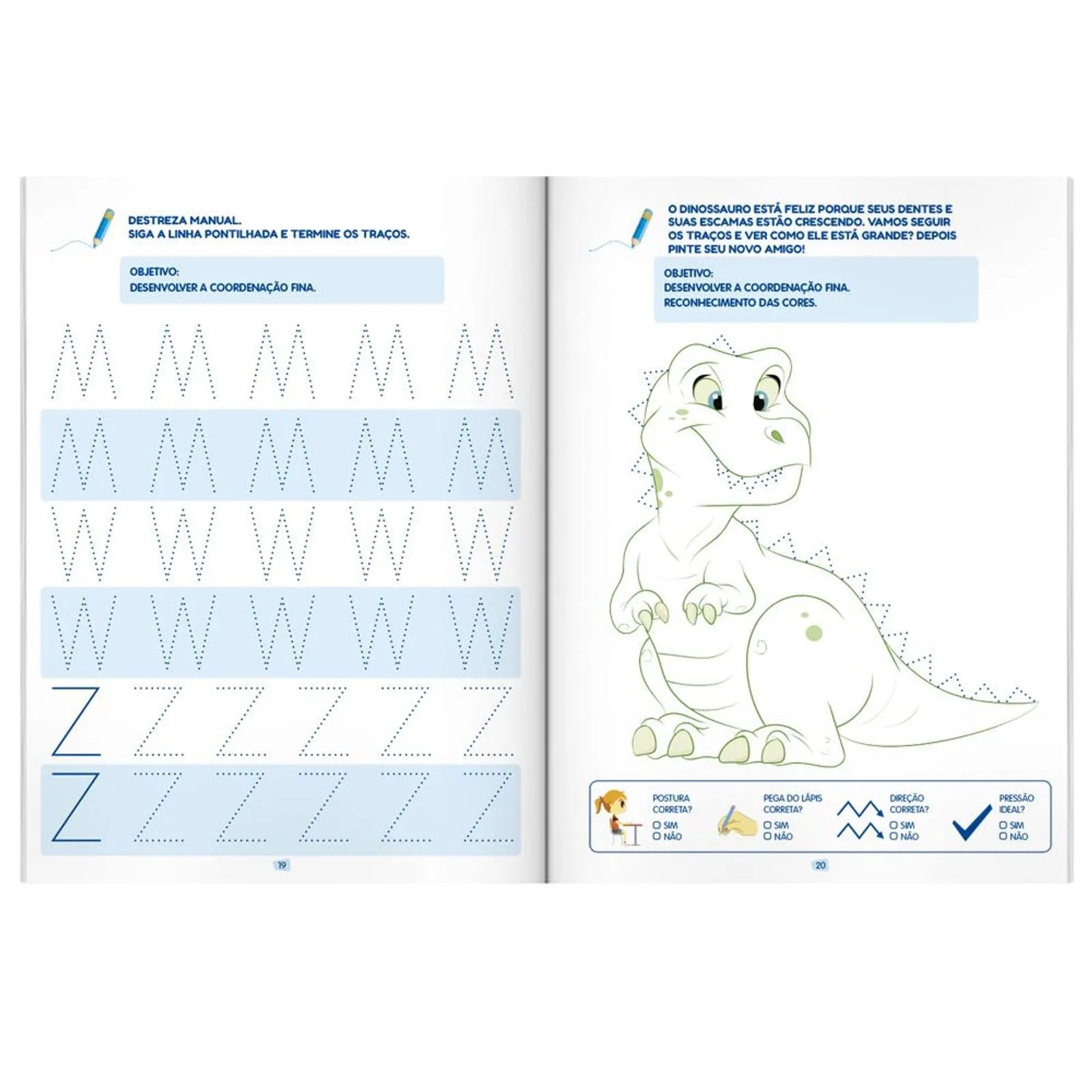 \par \bullet Objetivos propostos identificados em cada atividade, sendo uma excelente ferramenta de apoio escolar. Com o objetivo de contribuir com o desenvolvimento da coordena\'e7\'e3o motora fina, habilidades manipulativas, uma m\'e3o dominante e a coordena\'e7\'e3o simult\'e2nea, que possibilita usar as duas m\'e3os juntas, esta obra auxilia a crian\'e7a no processo de transi\'e7\'e3o tranquila dos elementos de pr\'e9-escrita para a escrita das letras do alfabeto. Por meio de uma abordagem sistem\'e1tica, por\'e9m divertida, desenvolve as habilidades fundamentais para as crian\'e7as aprenderem os primeiros tra\'e7os utilizados para fazer desenhos e, ent\'e3o, combinados para fazer letras e n\'fameros, atrav\'e9s de seis tra\'e7os essenciais para a forma\'e7\'e3o das letras do alfabeto.\fs20