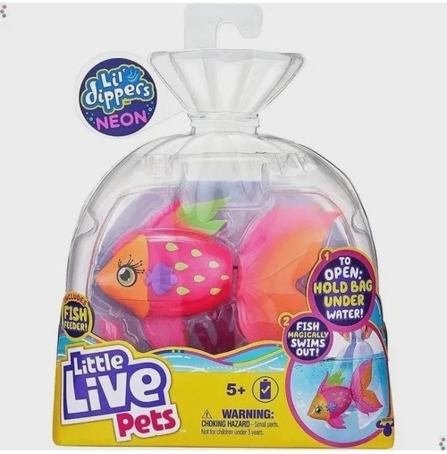 Little Live Pets - Lil Dippers adoram nadar e mostrar suas barbatanas! Esses peixes lindos têm a experiência de unboxing mais mágica! Mergulhe sua bolsa que eles estão embalados na água. à medida que o saco enche, a água ativa esses belos peixes de brinquedo, e eles ganham vida e nadam mostrando suas elegantes barbatanas! Lil Dippers tem o movimento mais incrível da vida enquanto nadam sobre swishing sua cauda colorida e barbatanas! Cada Lil Dipper vem com uma garrafa de alimentação mágica para que você possa interagir com seu peixe. Veja como eles nadam em direção a ele para se alimentar.