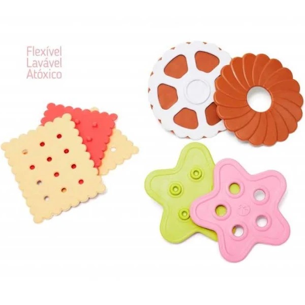 É hora de fazer bolachas! Peças criativas com formato de bolachas em diferentes cores e texturas que estimulam os sentidos dos pequenos. As peças são produzidas com material especial macio lavável, perfeito para manusear. A diversão é garantida na hora de montar as bolachas, ao total são nove peças para brincar e desenvolver coordenação motora. E o mais gostoso é que as bolachas vêm com cheirinho de morango, baunilha, limão ou chocolate.