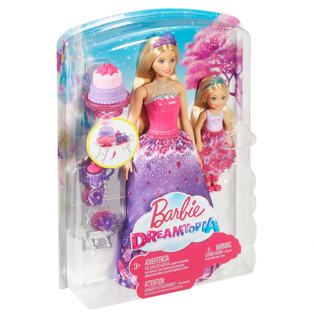 Contém: 1 boneca Barbie, 1 boneca Chelsea, 1 bandeja com acessórios, 1 bolo em camadas.