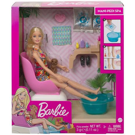 A Barbie sabe muito bem o que fazer para se sentir bem e para isso ela escolheu passar um dia no Salão de Manicure e Pedicure! Ela está pronta para cuidar de suas mãos e seus pés. As crianças poderão sentar a Barbie na cadeira, dobrar seus joelhos que são articuláveis e colocar seus pés dentro da bacia. Encha a bacia com água e um dos saquinhos com espumantes e surpresa! Ele cria uma sensação semelhante a um spa! Depois, seque os pés com a toalha e use a esponja com água fria para mudar a cor das unhas dos pés e também das mãos. Além disso, acompanha diversos acessórios como loção especial, um chinelo e ainda seu cachorrinho para lhe fazer companhia. Agora cuidar da Barbie ficou muito mais legal e divertido com a Barbie Salão de Manicure e Pedicure da Mattel!