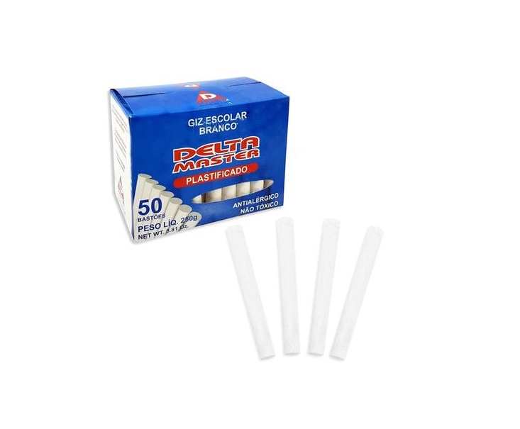 Giz Escolar Branco Plastificado Delta 50 Unidades. Um giz de alta qualidade, produzido com gesso ortopédico envolvido em uma fina camada plastificante.