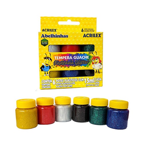 Tinta Tempera Guache Glitter Acrilex contém 06 potes plásticos com 15ml de tinta cada, com cores variadas com glitter. A tinta guache Acrilex é um importante instrumento para o desenvolvimento da criatividade, coordenação motora e percepção visual das cores.