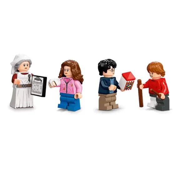 Jovens bruxas e feiticeiros se unem a Harry Potter, Ron WeasleyTM e Hermione GrangerTM em um conjunto versátil baseado em uma cena memorável de Harry PotterTM e o Prisioneiro de AzkabanTM. Dentro da Ala do Hospital de Hogwarts há 3 camas, um biombo e Madame Poppy Pomfrey empurrando seu carrinho cheio de poções e doces. Ron está na cama com uma perna enfaixada, e há uma garrafa do nojento Skele-gro à mão. Enquanto isso, na torre do relógio, Harry e Hermione estão usando o Time-TurnerTM. As crianças giram a torre para fazer os ponteiros do relógio girarem e viajam no tempo para outra aventura mágica. As metades superior e inferior do conjunto se destacam para que outros módulos possam ser empilhados entre elas, e o conjunto se conecta com outros da série para criar um Castelo de Hogwarts inteiro.