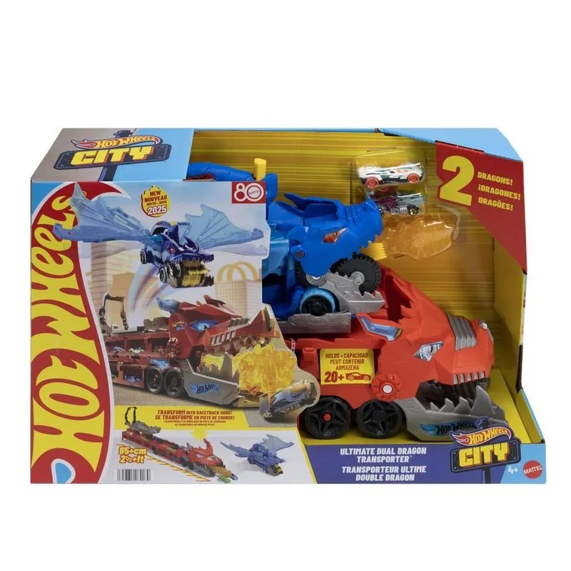 Depois de derrubar carros com o dragão cuspidor de fogo, você pode destravar o dragão menor e transformá-lo em uma pista de corrida! Você pode pressionar o botão para fazer com que suas asas se movam e imitem um dragão de verdade e, em seguida, mergulhar para fazê-lo comer carros. Você pode voltar para a base e liberar os veículos nos lançadores, onde eles poderão decolar em pistas lado a lado!