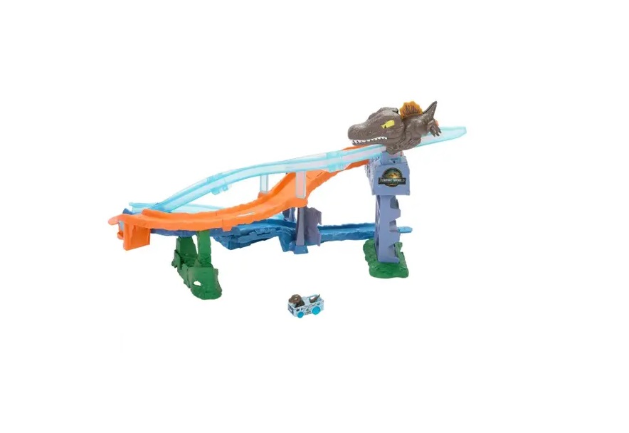 É uma corrida pela sobrevivência no Conjunto de Pistas Crash & Splash do Hot Wheels RacerVerse Jurassic World, onde um Velociraptor fundido do RacerVerse enfrenta um Espinossauro. Coloque o Racer incluído no topo do conjunto, onde o faminto Espinossauro está acelerado e pronto para partir. Há três resultados possíveis enquanto eles correm pela dupla hélice. Um Velociraptor de Corrida Hot Wheels RacerVerse está incluído, com uma decoração exclusiva para maior colecionabilidade. Conecte a pista Hot Wheels ao final para aventuras sem fim.