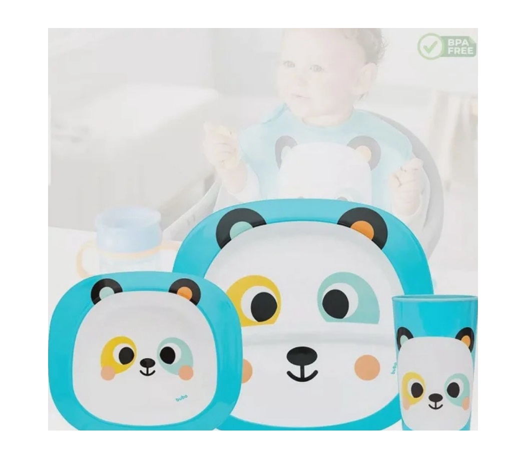 Conjunto com um prato com divisórias, uma tigela bowl e um copo, coloridos e estampados, da marca Buba.