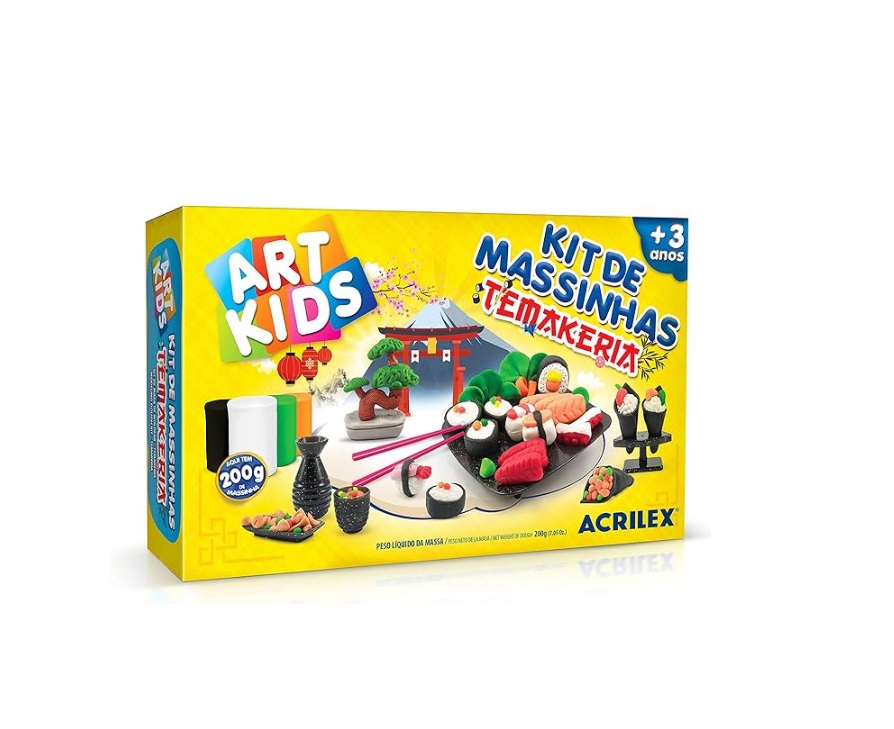 O Kit Contém: 4 Massinhas de Modelar Soft (50gr cada), 1 prato, 2 moldes, 2 faquinhas, 1 porta temaki, 1 porta shoyu, 1 par de hashi e 2 acessórios.