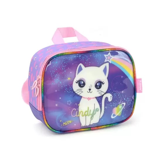 Lancheira infantil Cindy, composta de poliéster e PVC, possui fechamento em zíper, logo em silk e alças ajustáveis.