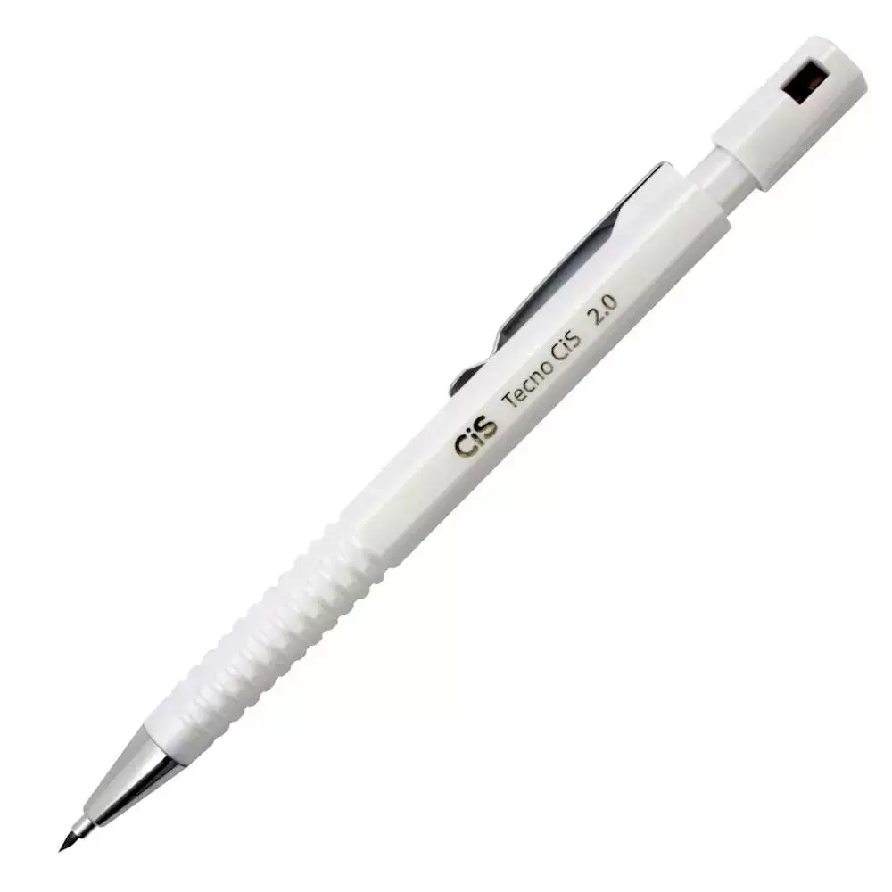 Lapiseira técnica com grafite 2.0mm da CIS, área de grip ergométrico, clip de metal e apontador.