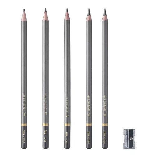 Conjunto com 5 graduações + apontador metálico: traços hb, 2B, 4B, 6B e 8B.