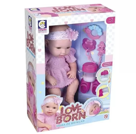 \par Fofinha e delicada como um beb\'ea de verdade, a Love Born Hora de Brincar est\'e1 pronta para receber seus cuidados com ela e vivenciar muitas brincadeiras juntas. Ela vem com copinho m\'e1gico, chupeta com prendedor e um lindo par de sapatinhos para complementar o divertimento. Ao deitar a sua boneca, ela fecha os olhinhos e ao levantar abre.