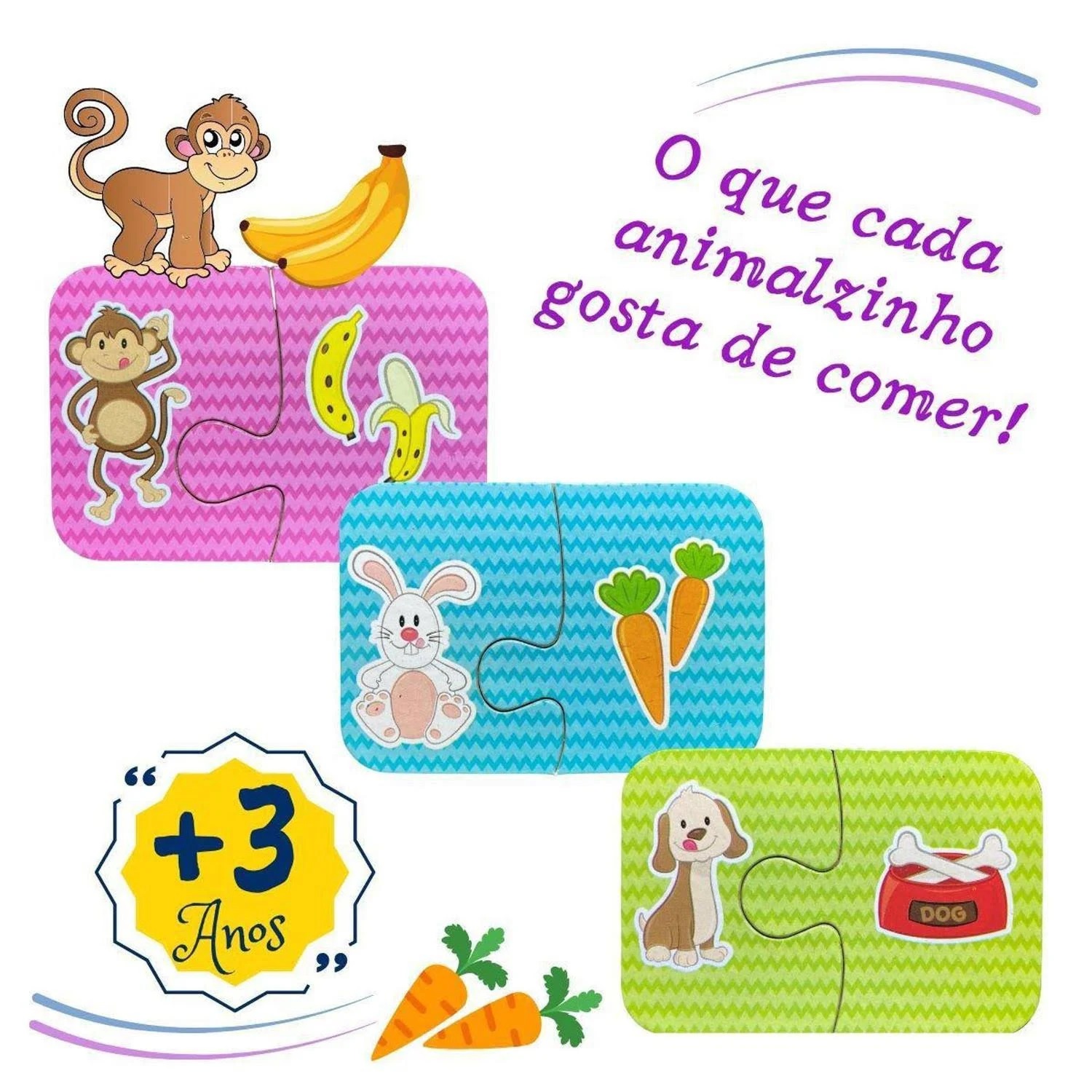 Nesse jogo a criança vai observar cada animal e encaixar a peça que corresponde à sua comidinha. Os pares são da mesma cor para auxiliar na tarefa. Faz parte da coleção Be a Bá da Nig, com diversos brinquedos e atividades para as crianças aprenderem enquanto brincam!
