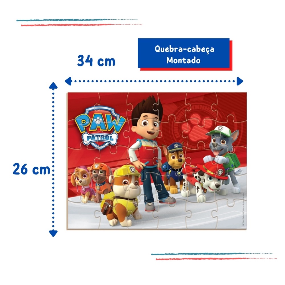 Quebra Cabeça educativo com 30 peças em madeira, fácil de montar e resistente. As crianças vão testar sua capacidade de concentração e memória, encaixando as pecinhas com os personagens da Patrulha Canina.