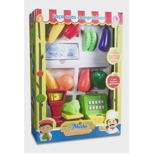 Vem com balança e uma máquina registradora, legumes e dinheirinhos.